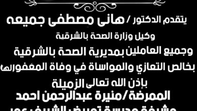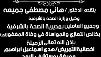 وكيل وزارة الصحة بالشرقية ينعي مشرفة مدرسة التمريض بشريف عمر بفاقوس