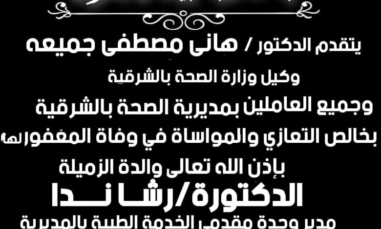 وكيل وزارة الصحة بالشرقية ينعي وفاة والدة مديرة وحدة شئون مقدمي الخدمة بالمديرية