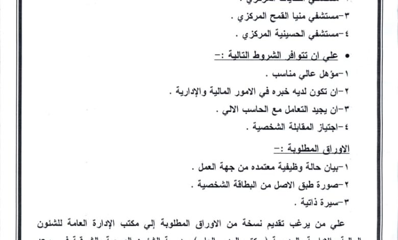 تعلن الإدارة العامة للشئون المالية والإدارية بمديرية الشئون الصحية بالشرقية عن حاجتها إلى رؤساء شئون مالية وإدارية بمستشفيات (الإبراهيمية – القنايات ـ منيا القمح – الحسينية) المركزية بمحافظة الشرقية، وذلك وفقاً للاشتراطات المذكورة بالإعلان.