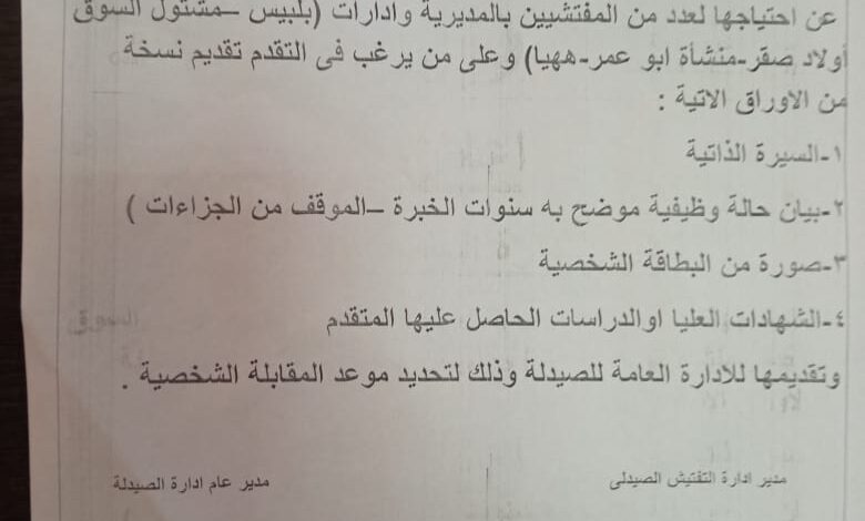 تعلن الإدارة العامة للصيدلة بمديرية الشئون الصحية بالشرقية عن حاجتها إلى كوادر جديدة للعمل بالتفتيش الصيدلي بالمديرية والإدارات الصحية، وفقأ للاشتراطات المذكورة بالإعلان.