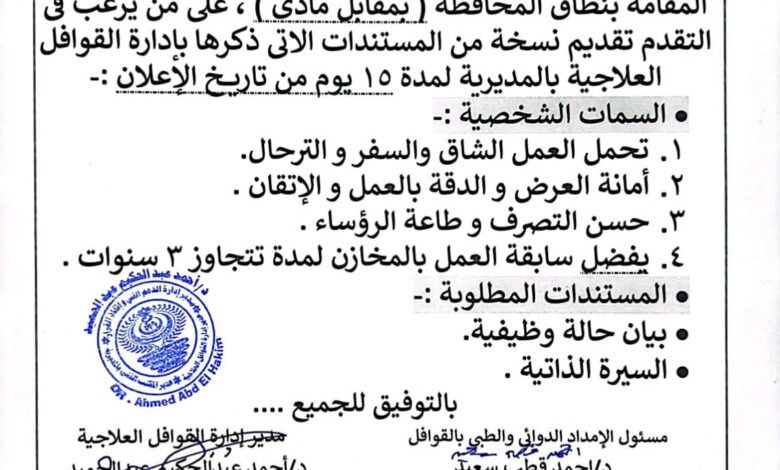 وعلى من يرغب في التقدم يتم تقديم الأوراق المطلوبة لإدارة القوافل العلاجية أو إدارة الدعم الفني واتخاذ القرار بالمديرية، وذلك في موعد غايته أسبوعين من تاريخ نشر الإعلان.