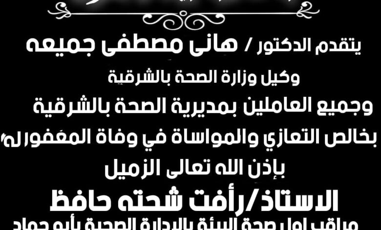 بقلوب مؤمنة بقضاء الله وقدره، وبمزيد من الحزن والأسى، يتقدم السيد الدكتور هاني مصطفى جميعة وكيل وزارة الصحة بالشرقية، والعاملون بمديرية الشئون الصحية بالشرقية، وجميع العاملين بالإدارة الصحية بأبو حماد، بخالص العزاء في وفاة المغفور له بإذن الله تعالى الزميل الأستاذ رأفت شحتة حافظ مراقب أول صحة البيئة بإدارة أبو حماد الصحية، والذي وافته المنية عن عمر يناهز ٥٩ عاماً.
