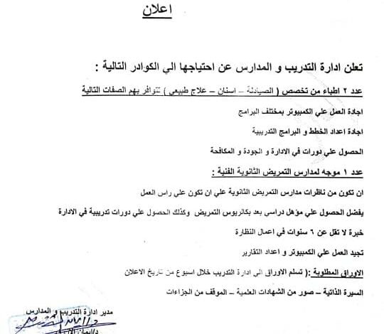 تعلن إدارة التدريب والمدارس بمديرية الشئون الصحية بالشرقية عن حاجتها إلى ٢ من الكوادر الطبية، وموجه لمدارس التمريض، للعمل بالإدارة على أن يتوافر بهم الاشتراطات المذكورة بالإعلان.