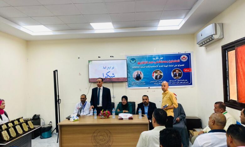 وعقب ذلك شهد وكيل وزارة الصحة بالشرقية حفل تكريم نقابة تمريض الشرقية بالتنسيق مع نقابة العلوم الصحية بالشرقية، بقيادة الدكتورة سماح محمود نقيبة تمريض الشرقية ومديرة إدارة التمريض بمديرية الشئون الصحية، والأستاذ علي بسيوني نقيب العلوم الصحية بالشرقية ومراقب أول المديرية، لهيئة التمريض والفنيين والمراقبين الصحيين بمستشفى الأمراض الصدرية بالزقازيق، نظراً لجهودهم المخلصة المبذولة، لحصول المستشفى على الاعتماد من قبل الهيئة العامة للاعتماد والرقابة الصحية، بعد استيفاء كافة الاشتراطات الصحية والالتزام بمعايير الجودة “جهار” الصادرة عن الهيئة العامة للاعتماد، والحاصلة على الاعتماد الدولي من الاسكوا، للانضمام إلى منظومة التأمين الصحي الشامل خلال المراحل القادمة، وذلك بقاعة الاجتماعات بالمستشفى، في حضور الفنان خالد بيومي نقيب الموسيقيين بالشرقية، والذي شارك الحفل ببعض الفقرات الغنائية، شملت أغاني حماسية ملهمة تعبر عن أهمية الحفاظ على الوطن، وعن دور التمريض والجيش الأبيض في الحفاظ على صحة وسلامة المواطنين.