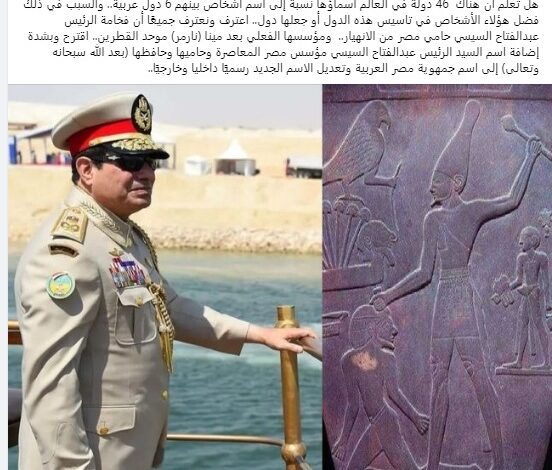 وإلى نص ما كتبه “القاسمي”: “هل تعلم أن هناك 46 دولة في العالم أسماؤها نسبة إلى اسم أشخاص بينهم 6 دول عربية.. والسبب في ذلك فضل هؤلاء الأشخاص في تاسيس هذه الدول أو جعلها دول.. اعترف ونعترف جميعًا أن فخامة الرئيس عبدالفتاح السيسي حامي مصر من الإنهيار.. ومؤسسها الفعلي بعد مينا (نارمر) موحد القطرين.. أقترح وبشدة إضافة أسم السيد الرئيس عبدالفتاح السيسي مؤسس مصر المعاصرة وحاميها وحافظها (بعد الله سبحانه وتعالى) إلى اسم جمهوية مصر العربية وتعديل الاسم الجديد رسميًا داخليا وخارجيًا”
