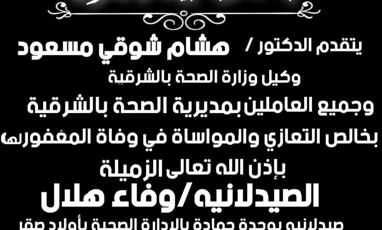 وكيل وزارة الصحة بالشرقية ينعي وفاة الصيدلانية وفاء هلال بالإدارة الصحية بأولاد صقرب