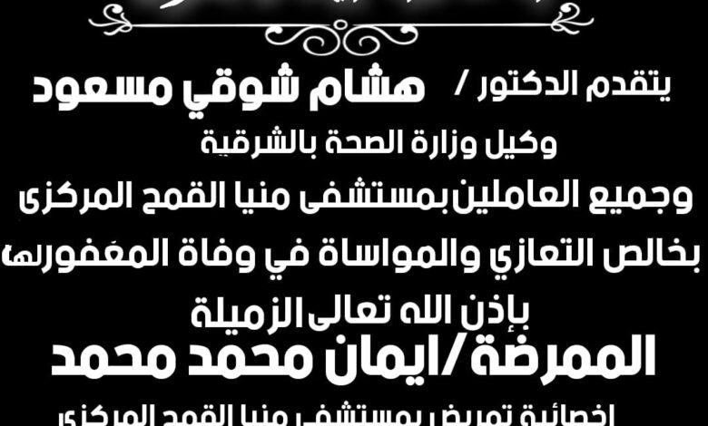 بقلوب مؤمنة بقضاء الله وقدره، وبمزيد من الحزن والأسى، يتقدم السيد الدكتور هشام شوقي مسعود وكيل وزارة الصحة بالشرقية، والعاملون بمديرية الشئون الصحية بمستشفى منيا القمح المركزي، بخالص العزاء والمواساة في وفاة المغفور لها بإذن الله تعالى الزميلة إيمان محمد محمد أخصائية التمريض بمستشفى منيا القمح المركزي، والتي وافتها المنية مساء أمس الأربعاء.