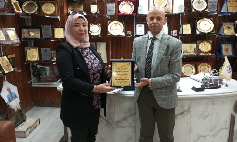 . مديرة وحدة التخاطب بمستشفى ديرب نجم تهدي وكيل وزارة الصحة بالشرقية درعاً تذكارياً لمؤازرته لها