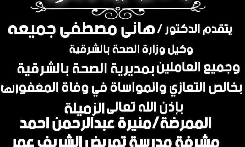 بقلوب مؤمنة بقضاء الله وقدره، وبمزيد من الحزن والأسى، يتقدم السيد الدكتور هاني مصطفى جميعة وكيل وزارة الصحة بالشرقية، والعاملون بمديرية الشئون الصحية، وجميع العاملين بالمدرسة الثانوية الفنية للتمريض بشريف عمر بفاقوس، بخالص العزاء والمواساة في وفاة المغفور لها بإذن الله تعالى الزميلة منيرة عبدالرحمن أحمد مشرفة مدرسة التمريض بمستشفى شريف عمر بفاقوس، والتي وافتها المنية أمس الأحد.